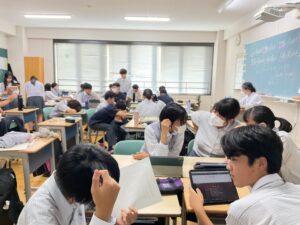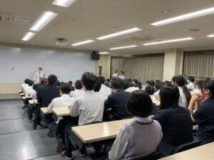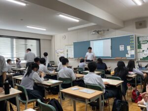 中学校主事から研修旅行に向けての心構えとして、時間を厳守することと服装を正すことについて話を聞きました。また、学年主任から「時間を厳守すること・静まること・周りを気にかけることの3点を大切にしよう」という話を聞きました。研修旅行に向けて、団体で行動するという意識が高まりました。