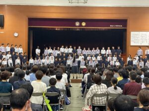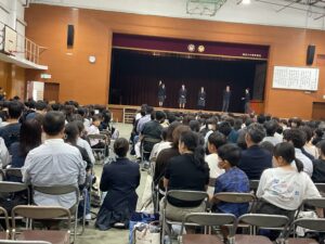 全体会は第一体育館にて実施しました。初めに中学1年生による合唱が行われ、来場者の方々に堂々と歌い上げる姿をご覧いただきました。