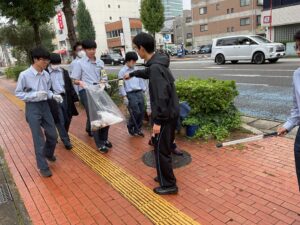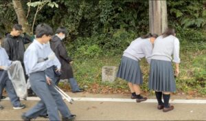 小雨が降る中での活動でしたが、参加した生徒たちはトングと袋を手に積極的に美化活動に励んでいました。