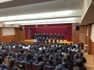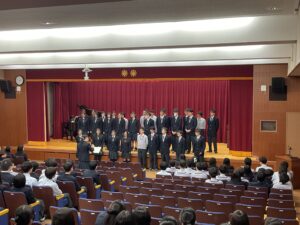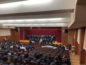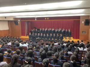 12月8日(月)6・7限、高校1年生を対象に、ウグイスホールにて「合唱コンクール」を行いました。元々11月に行われる予定でしたが、延期となり今日を迎えました。インフルエンザの流行に伴い、限られた時間の練習になりましたが、各クラスで工夫を重ね、心と歌声をひとつに学年の仲間に届けました。どのクラスも素晴らしい合唱になりました。