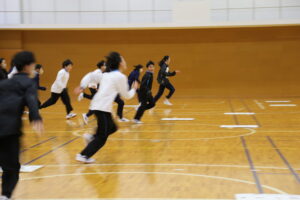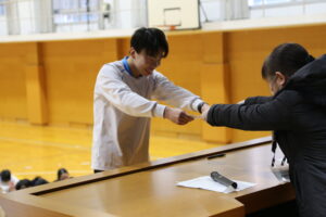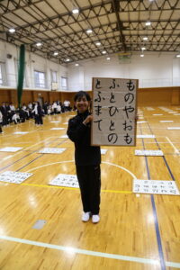 1月15日(木)6・7限に第一体育館にて、中学2年生を対象にジャンボ百人一首大会を実施しました。実際のものを約100倍にした大きさで取り札を作成し、それらを用いて班対抗・クラス対抗で競いました。