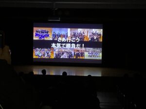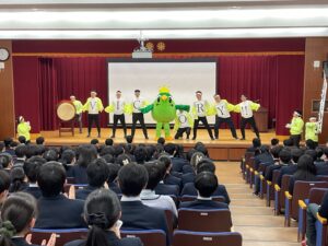 受験生を応援するメッセージ映像から始まり、「共通テスト応援隊」とウッピーによるエール、校長先生からの激励のお話、学年の先生方による注意事項の伝達や激励の言葉がありました。生徒たちは時折うなずきながら緊張した面持ちで耳を傾けて、明日からの共通テストに備えました。