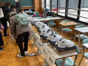 はじめにウグイスホールにて校長挨拶ののち、学習に関する説明や使用教材の説明、制服に関する説明などを行いました。その後各教室に設営された会場にて規定品の購入などを行いました。