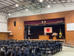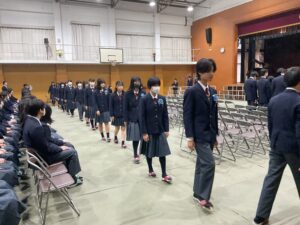 3月19日(木)3限に第一体育館にて、中学校全体を対象として「令和7年度中学校修了証書授与式」を挙行しました。
