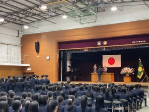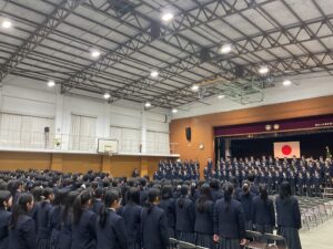 胸に花のコサージュをつけ、少し緊張した面持ちで中学3年生が入場し、式が始まりました。式では、1、2年生と3年生がそれぞれ合唱を披露しました。心を込めて歌い上げる姿と美しいハーモニーは、会場に温かな感動をもたらし、互いのこれまでの努力と成長を称え合うひとときとなりました。