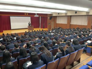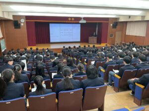 はじめに進学推進部長の先生から、推薦入試についての注意事項や日常生活における心構えについて話がありました。