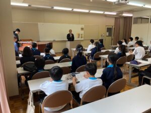 校長先生からリーダーとして望まれているのは何かを考えて行動することについて、教務部の先生からは学生会館での宿泊に関する注意事項の話がありました。生徒たちは真剣な表情で話を聞き、リーダーとしての自覚を持ち始めているようでした。また、自己紹介では自分の特技を披露して、和気藹々の雰囲気で研修を受けていました。